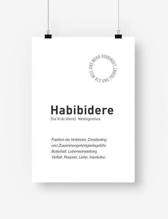 Habibidere ist ein Wortspiel, eine Symbiose aus dem persischen Habibi (was für Schatz, Liebling oder Freund:in steht) und der bayerischen Begrüßung Habedere (Hochdeutsch: Ich habe die Ehre). Für uns bedeutet HABIBIDERE frei übersetzt "Hi Freund:in". Eine schöne Message an alle die ein positives und freundliches Miteinander begrüßen.
